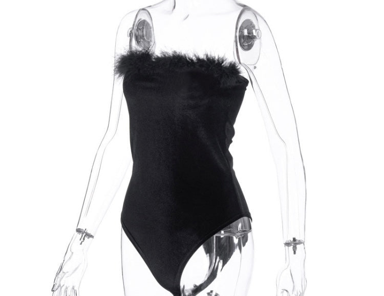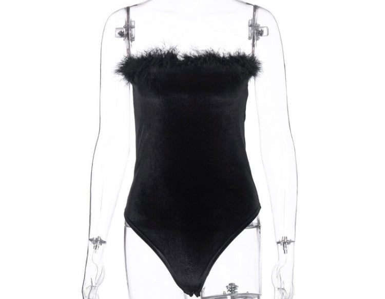 (Custom Product) Black sleeveless bodysuit with fur around neckline