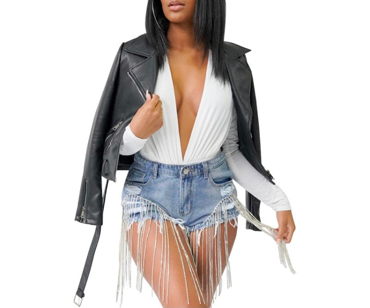 Black leather jacket with silver fringes on back